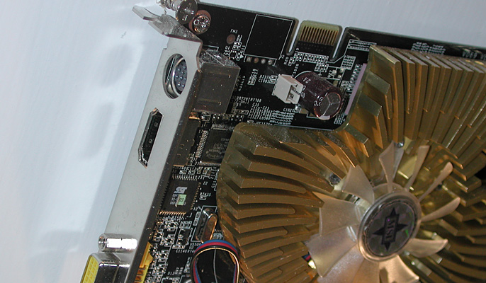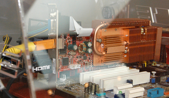 HDMI出力端子を搭載したファンレスカード。(光の関係で少々分かりにくいが)写真でHDMI端子の上にあるのはサウンドのデジタル入力端子で,ここに入力されたサウンドデータが,グラフィックス/ビデオとミックスされてHDMI端子から出力される仕組みになっている。付属のHDMI−DVI変換アダプタを用いればDVI接続も可能とのこと。