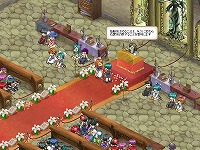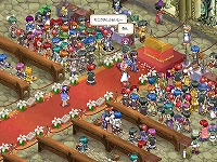 このイベントは,以前の記事でもお伝えしたとおり,「ミンツ教会・お祈りの部屋」の中で行われる,プレイヤーキャラクターのカップルが合同で行う結婚式。 本日16時には,その第一回が行われたが,スクリーンショットを見れば分かるとおり,平日の夕方にもかかわらず大盛況となった。第二回も本日20時から行われたが,明日以降の予定は以下のとおり。