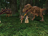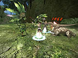 さて,肝心の新エリアだが,単にジャングルと呼ぶには,少々時代がさかのぼり過ぎているような気もしないではない。17〜18世紀のヨーロッパをイメージさせるコインブラから乗った船を降りたら,そこはジュラシック・パークだった,といったところか。巨大なは虫類(恐竜)や巨大な植物タイプのもの,そして始祖鳥のようなモンスターが出現するのだ。 今回テストプレイできたエリアは,縦に細長い道が続くうえに,恐竜型モンスターの足は速く,スカウトのスキル「アクセラレーション」をかけても,ちょっと逃げ切れなかった。ちなみに今回テストに使ったキャラクターはすべてレベル100で,それに見合った装備をつけていたのだが,それでもスカウトとウィザードは早々に戦闘不能という厳しさだ。