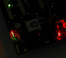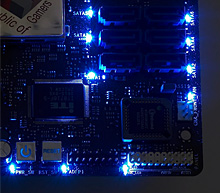 詳細は不明だが,入手した写真を見る限り,マザーボード上に埋め込まれたLEDは切り替えて点灯させられるようだ。左は,ボード上に用意された電源/リセットボタンなどを目立たせているところで,右は各種コネクタを目立たせているところのように見える。右ではSerial ATAのポート番号などをはっきり視認できており,PCのメンテナンス時にはかなり便利そうな雰囲気