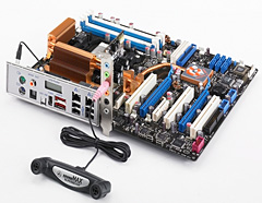 8フェーズ電源回路と,機能性高分子アルミ固体電解コンデンサの採用は,電源周りの安定性への配慮と言い切ってしまっていいだろう。 続いて,SupremeFXだが,これはノイズ対策が行われているとされる専用サウンドカードのことだ。High Definition Audio CODECチップをサウンドカード上に搭載し,マザーボードから物理的に分離することによって,サウンド出力におけるノイズの混入を減少させたという。 Array Micは,最近,ASUSTeK製高機能マザーボードに添付される例が目立ち始めたが,これは指向性が強く,プレイヤーの声以外を拾いにくいとされるマイク。「Echo Cancellation Technology」という機能を持ち,ボイスチャット時に不要なハウリングが生じるのも避けるという。ソフトウェア的に,マイク入力へのノイズキャンセル機能も用意しているとのことで,全体的にボイスチャット環境への配慮がうかがえる。