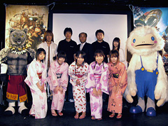 ネオ・スチームの発表会は,浴衣姿のイメージガール「ねおすちー娘」(仮)の登場でスタート。その後HUEのCEO,キム・ヨンマン氏より挨拶が行われた。キム氏からは,韓国では正式サービスが開始されたことや,中国市場で,100万人規模のクローズドβテストが実施されたこと,そして,「ポトリス2」を手がけたマルスチームが(韓国のハンビット社に移籍して)開発していることなどが語られた