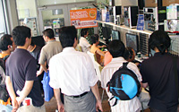 左:うだるような暑さの秋葉原で,クーラーの効いていない店頭にもかかわらず,Call of Duty 2のマルチプレイを体験する人達