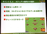 発表会のデモ機で実際にプレイしてみたが,Dキー,Sキーと方向キーのみと,操作方法はきわめてシンプル。キーボードのみで操作する不都合も思ったほどなく,苦痛なくプレイできる。 基本プレイ料金無料,オンライン対戦,ランキングシステムなど,最近のオンラインゲームの時流に乗ったシステムだが,一人用モードも装備するあたり,さすがは老舗のゲームメーカーというべき,ツボを押さえた作りとなっている。 オープンβテストで実装され,11月からアイテム課金が始まる予定の選手カードだが,コレクション的な要素だけでなく,お金を出せば選手を補強できる(かもしれない)という,現実世界のシステムを微妙に再現しているあたりが興味深い。