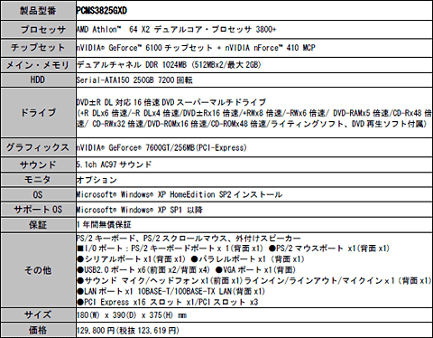 「PCMS3825GXD」という型番の与えられた推奨モデルは,Socket939版のAthlon 64 X2 3800+/2GHzにメインメモリ1GB,GeForce 7600 GTグラフィックスカードを搭載。さらに初回生産分には,500円分のWebMoneyと,グラナド・エスパダオリジナルクリアファイルが4種セットで付属。発表と同時に,ヨドバシカメラ各店において12万9800円(税込)で販売が始まっている。