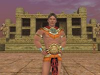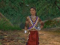 新衣装(4):エンベラ戦士のシンタ エンベラとは、パナマの東からコロンビアの北西にかけて住んでいる民族の呼称で、木の実の汁を使った幾何学模様のボディーペインティングをすることで知られています。両肩から腰にかけて交差させているシンタ(紐)は、鳥の羽や動物の骨で飾られています。