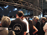 Electronic Artsのブースでは,ほぼ完成状態と思えるPetsが展示されており,ペット好きなドイツ人が次々と訪れてはシム人達にペットを飼わせまくっていた。 愛すべきペットを手に入れるには二つの方法がある。一つは,「キャラクターの作成」画面で新たにペットメイキングすることだ。作れるのは犬とネコで,シム人作りと同じように,性別,年齢(成人か子供,っていうか子犬と子猫),種類や目の色,顔つき,毛のもさもさ具合などやたらめったら細かく設定できるので,必ずやあなたのお気に入りの一匹が作成できるはず。なにしろ,性格や星座まで決めることが可能なのだ。 もう一つは,ペットショップへ出かけて購入すること。ただし,素のままのザ・シムズ2にはペットショップが存在しないので,これは追加データパックである「ハッピーショップライフ!」の導入が前提となる。これがインストールされていれば,お店のリストにペットショップが追加されるうえ,なんだったら,自分でペットショップを経営することも可能なのだ。ペットショップの経営! ペット好きにはたまらない仕事である。なにしろ店中ペットだらけ。夢のようではないか。