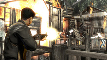 その後,ムービーシーンを挟んで敵が次々と現れ,激しい銃撃戦に突入。画面が赤みがかる独特のパレットタイムを多用し,階段の手すりを駆け上りながら銃を乱射,横っ飛びしつつ体をひねって銃を乱射,飛び乗った勢いでツツツと転がり進むキャスターに腹ばいで乗りながら乱射,とにかく乱射,乱射で敵を蜂の巣にしていく。まぁ,そのへんはとりあえず問題ない。 真の見どころは,銃撃または吹き飛んだ敵が突き破ることでハデに割れたガラスの破片が,バレットタイムのさなかで見事なまでにキラキラと飛び散る様子や,マシンガンやバズーカ砲の攻撃で柱やテーブルが粉々になっていく様子,壁のタイルが銃撃によって剥がれていく様子といった,挙動の美しさ。 そして,それら一つ一つの破壊処理が折り重なった結果,戦いの場となった部屋全体の光景が,結果的に完璧な「銃撃戦の後の荒れ具合」と化していたのには,本当に驚かされた。すべての破片がそのまま残っており,まるで映画のセットのような光景を,芸術的に生み出したのだ。