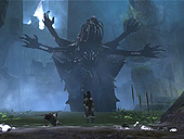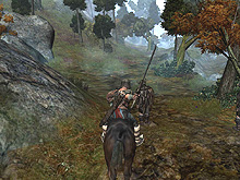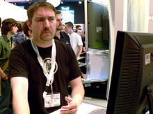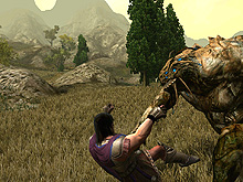 プレイヤーが森を駆けると,前方に凶暴な盗賊だか蛮族だかの一団が待ち構えている。一人が剣をかざして襲いかかってくるので,早速戦闘開始になる。以前にもお伝えしたように,Conanのゲーム性のキモは“戦い”である。巨大な剣や斧,棍棒などを振り回す重々しく血なまぐさい戦いがキーポイントなのだ。そのため,簡単なキー操作で多彩な技やコンボを繰り出せるように徹底したチューニングを行ったという。確かに「流麗な」とは言いがたいものの,見ているだけでもこっちが痛くなってくるような斬り合いが展開される。 キャラクターの動作はすべてモーションキャプチャによって再現され,本物の剣の達人をオスロのスタジオに招いてその動きを収録したとのこと。 ただ,残念ながらAIの調整が不十分で,ぼんやり立っているだけの敵が多く,その点は今後の開発の進捗を待ちたい。襲ってくるのはNPCではなく本物の人間が操作する敵で,ライプチヒの会場に置かれたPCはニュージャージーのサーバーを介してアメリカにつながり,そこにいるスタッフが相手をしているのだそうだ。時差を考えると,ご苦労様である。 入っている人間が少ないせいもあるだろうが,ラグなどはほとんど見られず,ネットコードに関しては問題は少なそうである。そのへんも,Anarchy Onlineの5年にわたる実績が物をいっているのだ。