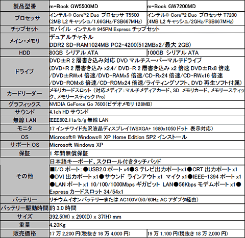 今回発表されたのは,GeForce Go 7600にPC2-4200 DDR2 SDRAM SO-DIMM 512MB×2,解像度1680×1050ドットのグレアタイプ(光沢)液晶ディスプレイという仕様は共通の2モデル。上位モデルの「m-Book GW7200MD」はCore 2 Duo T7200/2GHzを搭載してHDD容量は100GB,下位モデルの「m-Book GW5500MD」はCore 2 Duo T5500/1.67GHzを搭載してHDD容量は80GBとなっている。販売価格は順に,19万1100円,17万2200円(いずれも税込)だ。