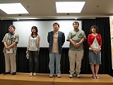 神田さんのビデオメッセージのあとは,審査員の登場。「とぅいんくる」エグゼクティブプロデューサーの越知雄一氏,プロデューサーのTANK☆MUSASHINO氏,開発元リヴィールラボラトリのディレクター小林真由美さん,「ネットランナー」と「にゅーあきばどっとこむ」編集長の武本佳久氏,そしてゲーム中でひよっこを演じる声優 小松理歌さんの5人が審査にあたった。 ちなみに今回のオーディションは,事前に公式サイトにて投票が行われており,ネットからの事前投票は1点,今回のイベント参加者の投票が3点,審査員の投票が10点となっており,その合計点数で上位3名をとぅいんくるガールズとして選ぶ,という形が採られていた。