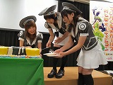イベントの最後には,もはや「とぅいんくる」イベントのお約束ともいえる,“とぅいんくるケーキ”がつつーっと出てきて,就任したばかりのとぅいんくるガールズによって切り刻まれ,来場者,関係者に振る舞われていた。ちなみに,今回のとぅいんくるの身体の中身はイチゴと生クリームとスポンジだった。おいしゅうございました。