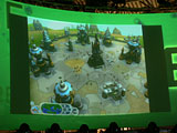 さて,一口で説明することの難しいSporeだが,ライト氏はゲームを六つのレイヤーに分けて話を切り出した。六つのレイヤーとは「Cell」(細胞),「Creature」(動物),「Tribe」(種族),「City」(街),「Civilization」(文明),そして「Space」(宇宙)だ。プレゼンはその順番で進んでいく。説明しながら,ノートPCにインストールしたSporeのエディタを立ち上げ,手早く生物を作り上げるライト氏。エディタはSporeと切っても切れない間柄だと言う。キャラクターの生成だけでなく,街造りだの,アイテムのデザインだの,Sporeのいたるところにエディタが関わってくるのだそうだ。 ライト氏は,やがてその生き物が増え,群れをなし,知能を備え,宇宙へ乗り出していくというゲームの流れを手早く見せてくれる。通訳を介しての解説であり,しかも騒々しい会場内ということもあって,いつものような「聴衆大うけ」というシーンはやや少なめだった。とはいえ,例えば「アブダクション・レイ」(誘拐光線)を使ってある惑星の生物を誘拐,それを新たに見つけた惑星に下ろして,その環境に順応するか確認する場面では,下ろした生物はたちまち先住生物によってたかって食べられてしまうなんて一幕も。それを見たライト氏が「ああ,ダメみたいだね。そういうこともあるよ」とさらりと言ったら,やはり大うけである。 スクリーンに映し出される場面はいずれもユーモラスで,まるで飄々とした雰囲気のライト氏の姿を反映しているかのようだった。そう感じられるのも,こうした形式のプレゼンテーションならではのことであり,それだけでも見る価値があるというもの。少なくとも,集まった多くのドイツ人の皆さんは「遊んでみたい」という顔をしていた。すっかりライト氏の術中にはまってしまったというわけである。