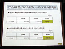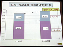 浜村氏の示した,2004〜2005年の市場動向。全体としては約9%の伸びを示しており,「2006年は,プレイステーション3の延期がありながら,すでにミリオンセラーが3本出ています。年末に次世代機が登場すれば,この数年で最高の結果になる可能性があります」とのことだ