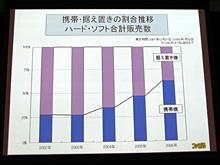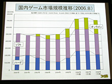氏はまず,2004〜2005年にかけての,ゲーム機とゲーム機用タイトルの販売状況を示し,市場は成長しているとした。このあたりは,初日に行われた基調講演とかなり重複した話なのだが,それほどまでに,ゲーム機中心の開発者達は市場の冷え込みを感じていて,明るい材料を求めているのだとすれば,なかなか興味深い。
