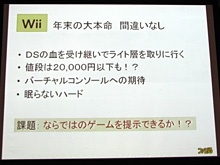 「Wii」は「2006年末の大本命で,間違いなく売れる。ただし,コントローラが特殊なので,今までのゲームの文法が染みついている人には違和感があるかもしれない」とのこと。発売時の価格は2万円を切ると見ているそうで,「ゲームボーイアドバンスと同じような売れ方をしていくのではないか」だそうだ