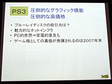プレイステーション3に関しては「ブランドイメージは非常に高く,映画のような最高級のグラフィックスを楽しみたい人は多い。だが,いささか高すぎるのと,Blu-rayは高解像度テレビが前提ということもあって,プレイステーション2のときのDVD-ROMドライブのようにはハードを牽引しない。2007年末ごろに真価を発揮し出すのではないか」とした