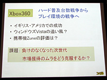 Xbox 360については「北米と英国での成功で,完全敗北はなくなったが,日本やドイツなどで売れていないと“市場のムラ”克服が課題。Microsoftの目標は,iTunes Music Storeのような独自のサイトで,音楽やゲームをダウンロードさせるディストリビューションビジネスにあると見る。その意味で,Windows Vistaとの連携が始まり,リビング(Xbox 360)と書斎(PC)を取りに行く,プレイ環境への勝負に持って行くだろう」という