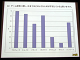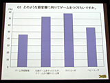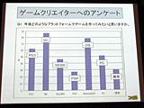 では,PCや携帯電話の台頭によって今後どうなるのか。浜村氏は,経済産業省の主導でゲーム開発者へのアンケートを行った結果とするグラフをいくつか示してみせた。それが下のグラフだが,注目すべきは一番左だろう。 どういった“クリエイター”にアンケートを取った結果なのか不明なので,「ある程度責任ある回答」なのか「現場レベルの希望」なのかは分からないが,PCでゲームを作ってみたいと考えている開発者が,全体の50%以上いるのは,正直驚きである。先日のテクモによる大々的な発表などを見るに付け,国内メーカーもPCゲーム――多くの場合は“オンライン”という枕詞が付くものの――を無視できなくなってきているように感じるが,この50%強の何割かでも,本腰を入れてくれるなら,国内PCゲーム業界は間違いなく活気づくはずだ。