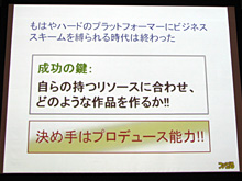 以上を踏まえ,浜村氏は「もはやプラットフォーマー(プラットフォームを握るメーカー)にビジネスを縛られる時代は終わった」と宣言する。「これまでは,プラットフォームを選択し,依存していくやり方が主流でしたが,今後はすべてのプラットフォームに可能性があるのです」という。企業に属しているか,個人かは関係なく,適切にアイデアとリソースを割り振ることができれば,誰にでもミリオンセラーになれるチャンスがあるとのことだ。