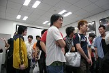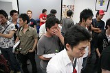 今回会場となった先端ナレッジフィールドは,選手達が試合を行うトーナメントエリアと試合の模様を観戦する会場が別々になっていて,観客が試合に熱狂して大きな歓声をあげても試合を行っている選手達の集中力を乱すことがないような作りになっていた。昨年,東京ゲームショウの会場で日本予選が行われたときは,ほかのブースの音がうるさかったり,選手と観客の距離が近すぎたりして「試合に集中できない」という不満が選手側から出ていたので,今回は選手達の事情も考慮したのだろう。しかし,観戦する側からしてみれば,選手達の様子を間近で見たいというのは正直な気持ちで,とくに出場している選手と親しい友人や,同じチームのメンバーなどは,選手の表情を見ながらすぐ側で応援したいはずだ。