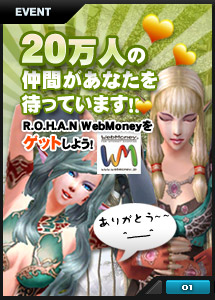 前者は,キャンペーン期間中にR.O.H.A.Nの公式サイトで新規会員登録を行うと,抽選で1000名に500円相当のWebMoneyが当たるというもの。後者は,10月15日24時までにキャラクターレベルを50以上まで育てたテスターの中から抽選で1000名に,1500円相当のWebMoneyが当たるというものだ。