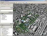 Google Earthの表示例。地形や建物などを簡易3D表示することができる。ちなみに細長いビルのようなものは東京タワーだ……