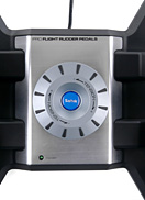 Pro Flight Rudder Pedalsは,機械式のセルフセンタリング機能を搭載するほか,ラダーにかかるテンション(圧力)の調整や,フットレストの長さ調節が可能であるなど,使い勝手への配慮が随所に見られるのが特徴だ。テンションの調節は本体中央部のダイアルで行う仕組みで,Saitek製品らしい,メカっぽい雰囲気の演出にも一役買っている。 本体を壁などに密着させ,踏み込んだときにラダーペダル自体が動かないようにする人は多いと思うが,本製品にはそれを補助する,本体の奥行きを伸ばすアタッチメントも付属。不要ならば取り外したり,あるいはフットレスト的に本体手前側での利用も可能だ(右の写真は,アタッチメントが本体手前側に取り付けられた状態のもの)。