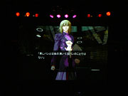 トークに続いてこの二人が披露するのは,オリジナル脚本に基づく“公開アフレコ”。オリジナル脚本とは言い条,その内容はマスターテリオンのシリアスな役どころを逆手に取ったコミカルなものであった。自称天才科学者であるドクター・ウェストが「どんな願いでも一つだけかなえようではないか」と大仰に申し出れば,マスターテリオンは落ち着き払って一言「パン買ってこい」。とまあ,そんな調子だ。この“キメセリフ”は脚本の要所で繰り返され,そのたびに来場者を沸かせていた。 前述したように,声優同士の掛け合いからなる“公開アフレコ”は昨今のキャラクターゲーム関連イベントでは定番の演し物なのだが,今回披露されたそれは,かなり気合いが入っている。なにしろ,用意されたのは作品本編のシナリオライター鋼屋ジン氏の手になる脚本であり,おまけに舞台のスクリーンでは,このイベントのために組まれたスクリプトにより,表情パターン付きのキャラクターグラフィックスとテキストが,演技の進行に沿って流れる。声優の生の演技に合わせて,ゲーム本編のような演出が再現されたのだ。 イベント用の脚本に,社内の若手で済ませることなくメインライターを動員,ここまでの仕込みを行ったニトロプラスの取り組みを,アージュの斉藤K氏が「御社,バカじゃね?」と溢れんばかりの笑顔で誉めるのが,まさしく当を得た論評となっていた。