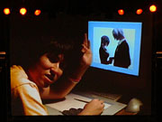グラフィッカーのなまにくATK氏。カメラ目線で愛嬌を振りまきつつ作業するところ(左)と,新作のPRをするところ(右)