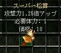 ◇アイテム概要 スーパー松茸・・価格:10Gold/効果:攻撃力1.25倍アップ(効果時間5分、マップ移動等で無効化) ビッグマロン・・価格:10Gold/効果:防御力1.25倍アップ(効果時間5分、マップ移動等で無効化)