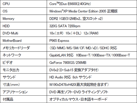 同製品の価格は13万9980円(税込)。BTOには対応しておらず,メインメモリ容量が1GB(PC2-5300 DDR2 SDRAM 512MB×2)で変更不可なのはゲーム用途を考えるとやや厳しい場合もあるが,それでもコストパフォーマンスは十分に高いといっていい。さらに,Windows Vista Home Premiumへ送料など諸経費込み3150円で移行できるMicrosoftのプログラム「今なら安心アップグレード」に対応しているため,Windows Vista Home Premiumへ安価で移行できるという点を,魅力に感じる人はいるかもしれない。
