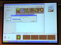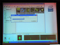 Core 2 Extreme QX6700(左)とPentium 4(右)を用い,「CPUとマザーボード以外は同一の環境」(インテル)で,10枚のRAWデータをJPEG形式の画像に変換するデモ。後者が約2分かかる処理を,前者が45秒で終わらせると説明された。なお阿部氏いわく「11月に予定している発表会では,もっとすごいデモをお見せしたい」とのこと