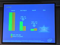 インテル代表取締役共同社長の吉田和正氏は,米国で2006年9月に開催されたIDF(Intel Developer Forum)の内容を繰り返す形で,開発コードネーム「Kentsfield」(ケンツフィールド)として知られてきた同社初のクアッドコアCPU,「Core 2 Extreme QX6700」を11月に発表すると明言。投入当初は,Extremeモデルとして,ハイエンド市場がターゲットになり,一般ユーザー向けは依然としてデュアルコアCPU(=Core 2 Duo)が中心になるが,2007年夏頃には,ボリュームゾーンにもクアッドコアCPUがかなりの割合で食い込んでくるという見通しを示した。