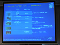 左はSanta Rosaプラットフォームの概要,右はUMPC用CPUのロードマップを示したスライド。Santa Rosaプラットフォームについては2006年10月18日の記事を参照してほしい。UMPC用CPUは,2007年に超低電圧版Core 2 Duoの半分のTDPで動作するCPUを投入し,将来的には1W以下で動作するよう,段階的に開発を進めていくとした