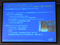 まずは,「2000個のCPUを用いたクリスマスツリー」から。これは, Core 2 Duo発表とつくばエクスプレスへの無線LAN環境導入1周年を記念した,インテルとつくばエクスプレスのコラボレーションとされており,つくばエクスプレス秋葉原駅構内にて,11月10から展示される。「いけばな草月流」監修・制作とのことだが,いずれにせよ,なかなか強烈な,秋葉原らしい(?)クリスマスツリーになりそうだ。