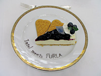 左はFURLAとのコラボレートキャンペーンを説明するスライド。右が実際に振る舞われたタルトだ。レアチーズタルトベースで,甘すぎずなかなか美味。ちなみに,ウェハをイメージしたというのは,写真上に見える2枚のウェハースである