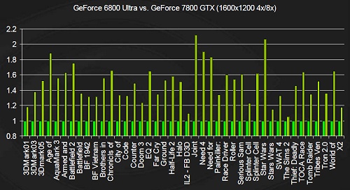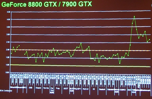 GeForce 8では,全体に1.5〜2.0倍の範囲にプロットが集まっているのが分かる。 GeFoece6からGeFoece7における性能向上グラフの縦軸の目盛りが0.2倍ずつ上がっているのに対し,今回のグラフは最低目盛りが0.5刻みであることに注意していただきたい。また,6→7の比較が1600×1200 4x/8xという当時のハイエンド環境のみでの比較であるのに対し,7→8のグラフは多彩なモードでベンチマークが取られている。見ると,伸び率が落ち込んでいる部分は,各ゲームで負荷の低い設定であって(それでも以前のハイエンド設定だが),高負荷設定になるほど性能差が広がっている傾向が見える。つまり,実質の性能伸び率はかなり高くなっており,現世代のゲームの1600×1200 4x/8x程度では,すでに飽和傾向にあるということである。 スペック上で性能を2倍にしたり,3DMarkなど,GPU負荷の非常に高いベンチで性能を2倍にすることはさほど難しくはない。実際のゲームでは,CPUがボトルネックとなりがちで,GPUの性能アップだけではそう簡単に2倍になることはない。ほぼ2倍近いフレームレートが達成されているというのは,実に驚くべきことだ。GeForce 8では,実際のゲームベンチレベルでもかなり大きな性能向上を果たしており,余裕すら感じさせる。まさに次世代ゲームのためのGPUというにふさわしい仕上がりといえるだろう。