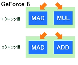 GeForce 7:4個のMADを1クロックで実行 GeForce 8:2+1個のMADを2クロックで実行?(ただし倍速動作)