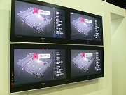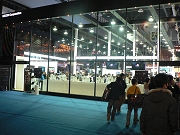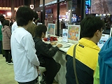 右の写真でも分かるとおり,ブースは九つのブロックに分けられ,正面に向けてはメインステージ,通路に面した側面にはオープンステージが設けられ,それぞれファン向けと一般来場者向けのイベントがひっきりなしに開催される。正直詳細は分からないのだが,オープンステージでは若手アイドルと思しき人がバラエティ的な演し物を繰り広げ,テレビカメラも据えられていた。 昨年のブースとて十分に大きなものだったのだが,今年のブースの特徴をまとめるなら,スタイリッシュないしプレステージ志向といったところ。黒い鎧戸のような金属製部材と,ブース側面を外と仕切るガラスの組み合わせはそれだけでシャープな印象を与えるほか,ステージ側面にまで小じゃれた飾り絵と電飾があしらわれている。ブース内を照らす照明も,比較的小型のものを多数設置して光を均等にするという,なかなかの高級志向だった。