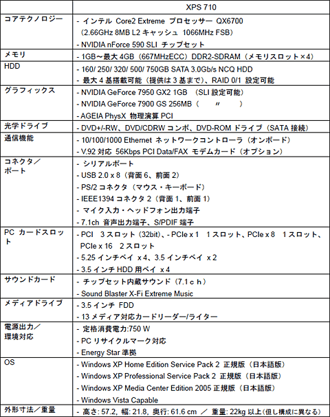 ●XPS 710の主なスペック(BTO選択肢も含む ※リリースより)