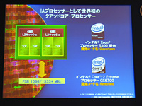 Intelの日本法人であるインテルは,2006年11月15日に,同社初のクアッドコアCPU群を発表した。発表のメインは,サーバーあるいはワークステーション向けCPUである「Quad-Core Xeon 5300番台」だったのだが,先にレビュー記事をお伝えしているデスクトップ向け製品「Core 2 Extreme QX6700/2.66GHz」についても,価格などの詳細が明らかになった。そこで今回は,このデスクトップ向けCPUを中心に,発表会の模様をお伝えしたい。