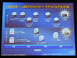左,中央:2006年1月の「Viiv」と「Centrino Duo」,そして10月の「VPro」と,プラットフォーム全体の性能向上を考慮して技術革新を行っていくと,インテル代表取締役共同社長の吉田和正氏は挨拶。2006年を「クアッドコア化の始まった年」と位置づけた