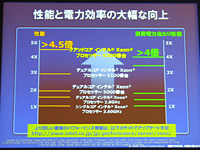 こちらはQuad-Core Xeon 5300番台の資料。せっかくなので掲載してみる。IrwindaleコアのシングルコアXeonと比べて,今回のQuad-Core Xeon 5300番台は性能で4.5倍以上,消費電力あたりの性能でも4倍以上高速とした。右はロードマップだ