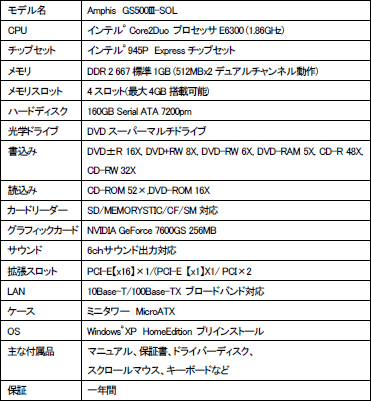 順に紹介していこう。推奨PCに認定されたのは,アロシステムが運営するPCショップ「パソコン工房」のミニタワーPC,「Amphis GS500III-SOL」。BTOに対応したPCで,最小構成では,CPUにCore 2 Duo E6300/1.86GHz(L2キャッシュ2MB),メインメモリにPC2-4200 DDR2 SDRAM 512MB×2,グラフィックスカードにGeForce 7600 GS(グラフィックスメモリ256MB)搭載製品を採用して,9万9980円(税込)となっている。本日よりパソコン工房の店頭や直販サイトで販売が始まっている。