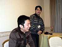 GMツトム氏だけでは不安だったのか(?),HUEマーケティングチームの岡澤知行氏(右)と広報担当の山本潤氏(左)も同席。話題がそれそうになると口を挟み,うまくWYDの話に戻るよう誘導していた