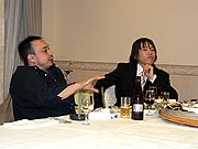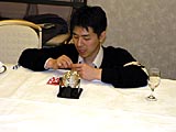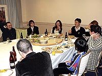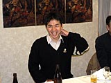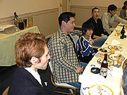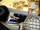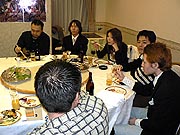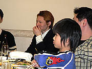 老若男女(老はいないけど)揃った参加者の面々。顔出しは快諾してくれたが,プライバシー保護のため,どの人物がどのキャラクターで,とまで細かく説明するのはご勘弁を。その代わり参加者リストは載せておこう。すべてキャラ名で,HOTDOGさん,★はやと★さん,マーチさん,SWCMさん,かおかおさん,†ちょこ猫†さん,メロリンQさんの7名(順不同)。ちなみに左の写真の奥(料理に手を伸ばしている人)は,HUEのジャン・ウジン氏