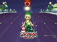 雪の降るクリスマスツリーや雪だるまの中を走るイメージです。