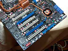 なお,COMMANDOの基本的な仕様はこれまでのR.O.G.シリーズとよく似た印象だ。チップセットを結ぶヒートパイプや,8フェーズの電源回路,オーバークロックテスト時などに有効な,I/Oパネル部のPOSTコード表示用ディスプレイ「LCD Poster」やオンボードの電源/リセット/CMOSクリアボタン,前述のExtreme Tweakerなどは,そっくり搭載している。 ちなみにヒートパイプとフィンによる冷却機構は,あくまでチップセットの冷却用という。電源回路は8フェーズ化と高品位部材の採用によって発熱を押さえており,特別な冷却機構は必要ないそうだ。「ケースファンさえ正常に動作していれば,電源回路とチップセットの熱が篭もるということはまずありません」(ユー氏)。