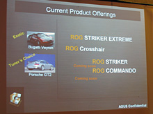 ASUSTeKのセッションでは,担当プロダクトマネージャーであるDerek Yu(デレック・ユー)氏から,ゲーマー向け製品ブランド「R.O.G.」(Republic of Gamers)についての説明があった。 同氏はR.O.G.ブランドを「A.I.シリーズの上位モデルではなく,ゲーマーとオーバークロッカーのためだけの特別なラインアップ」と位置づけ,豊富な機能面だけでなく,すべてがゲーマー向けにチューンされている点を強調。オーバークロック機能「Extreme Tweaker」を例に挙げ,「単にオーバークロック機能を提供しているのではなく,搭載するデバイスや信号制御周りで安定動作のためのチューニングを行っています」とコメントした。